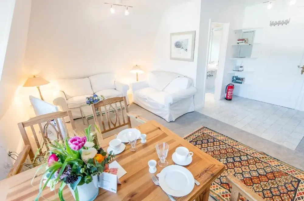 Lage: Direkt vor dem Gemeindehaus, nahe der Kirche, 5 Minuten Fußweg zur Bushaltestelle, 3 Minuten Fußweg zum Supermarkt, verschiedene Restaurants in unmittelbarer Nähe (maximal 15 Minuten entfernt), 5–10 Minuten Fußweg zum Watt (d.h. nah am Strand).